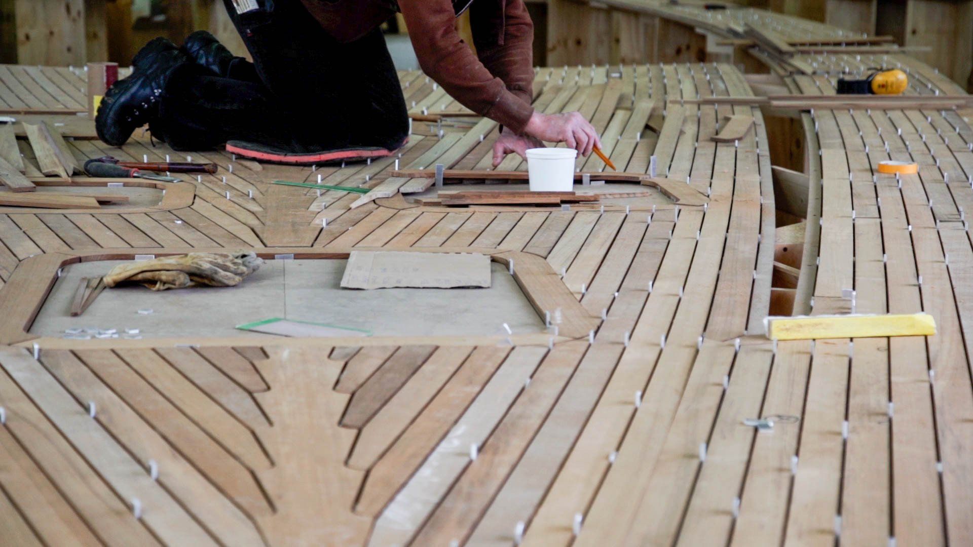 The installation of the teak deck on the 90 ft. YYachts Y9 took seven days and took place at the shipyard before the hull and deck were joined together.