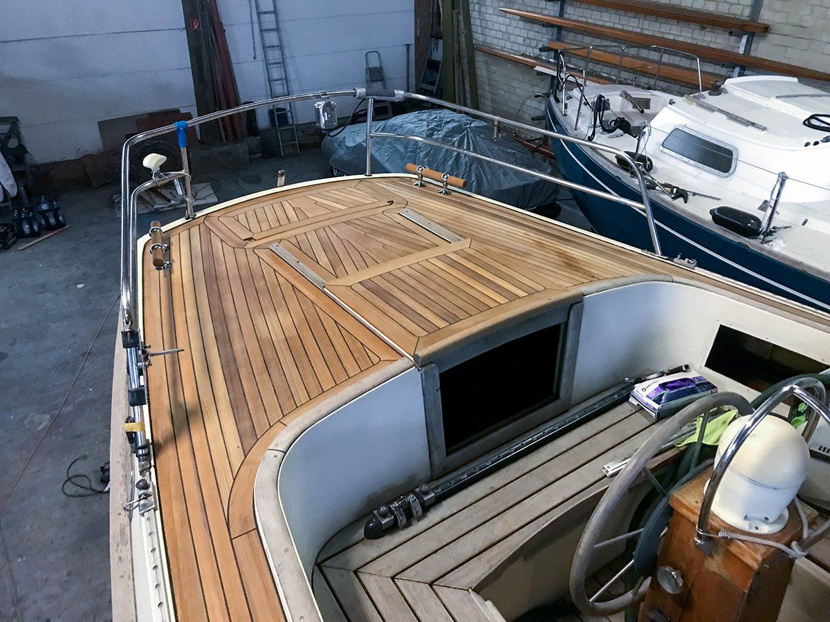 Ein neues vakummverklebtes Teakdeck in Stabdeckbauweise haben wir dieser Najad 34 Segelyacht (Mittelcockpit) gebaut und montiert. Das aus 3 Lagen formverleimte Schanzkleid konnte erhalten bleiben, wurde von uns aber mit einem neuen Schandeckel versehen.